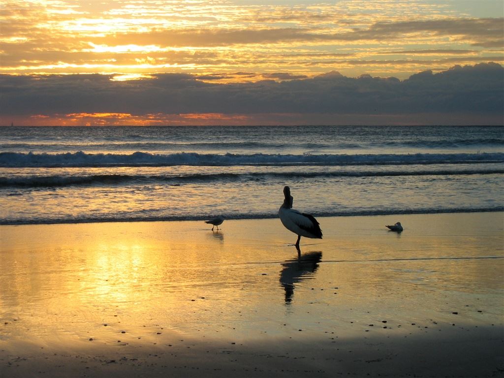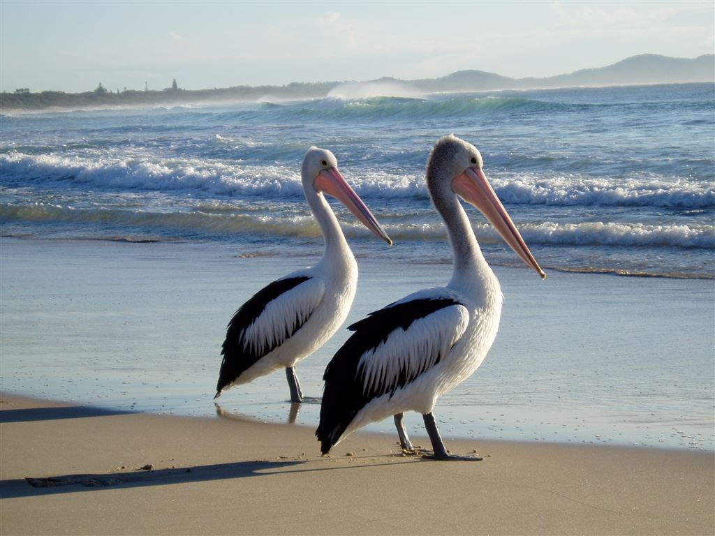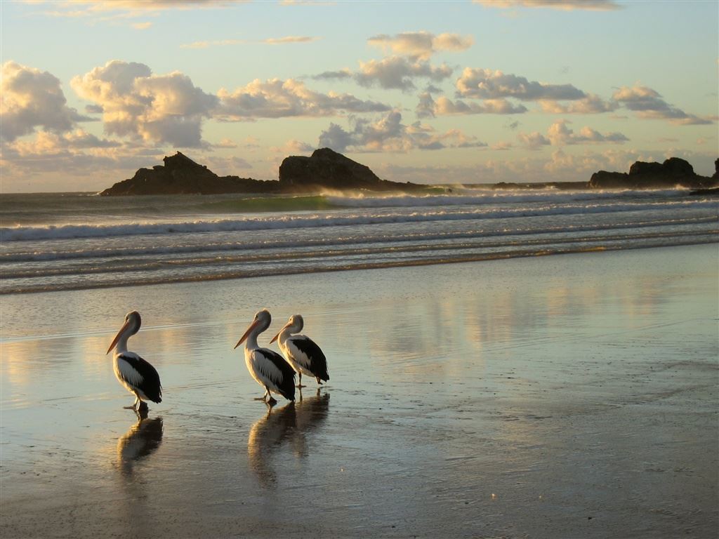 Pelicans enjoying the sunrise on Broken Head Beach. Early bird catches the - fish?